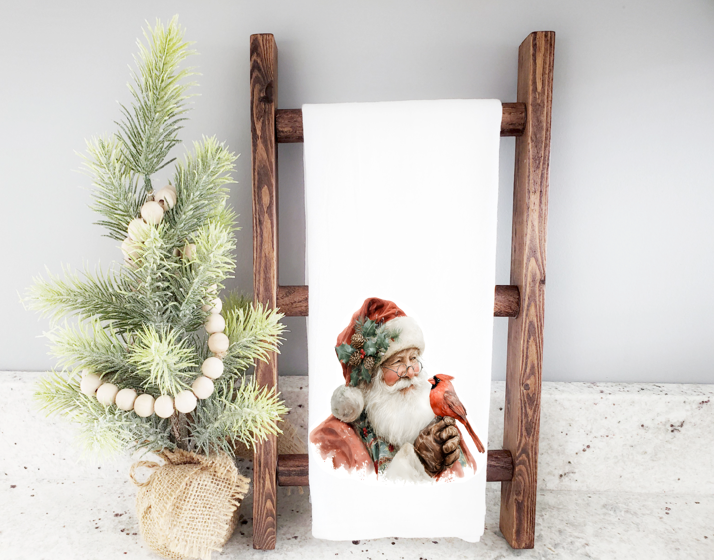 This high quality 100% cotton flour sack tea towel measures 28x28 and comes with a hanging tab. Because each tea towel is handcrafted no two will be exactly alike.